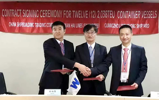 11月12日,黄埔文冲和中国船舶工业贸易公司作为联合卖方,在台湾与万海航运股份有限公司成功签订了12艘2038箱支线集装箱船订单。这不仅是黄埔文冲历史上接获的最大的单笔支线集装箱船订单,也是该公司首次与台湾知名班轮公司携手合作,写下了两岸同胞深化交流合作、开拓航运市场的新篇章。