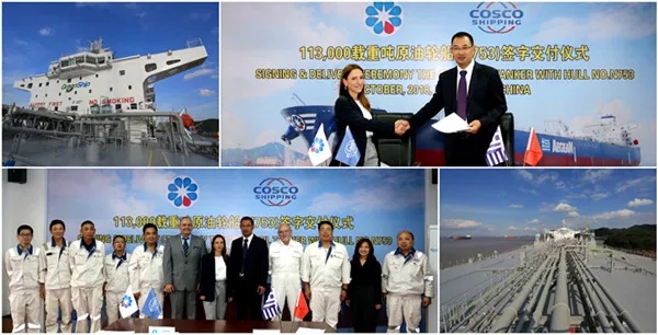 10月15日,舟山中远海运重工为希腊AEGEAN SHIPPING 公司建造的113K原油轮首制船(N753)签字交付。船东公司高层Panousi Georgia女士与舟山中远海运重工总经理周建华代表双方共同签署了交船文件。船东公司代表、船东银行代表,舟山中远海运重工常务副总经理黄旭、副总经理敖武平及项目组成员共同参加签字仪式。