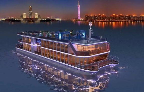 280客位珠江夜游船总长38.8米,型宽12.0米,型深3.2米,航速10.0节,是粤港澳大湾区首艘入级商业运营新能源客船,外观设计新颖独特,纯电池动力突显低噪音、低排放、绿色环保的优势,对于推动粤港澳大湾区旅游和交通产业的绿色发展具有重要意义。