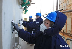 为确保该船按期实现试航节点,大船集团山船重工先后共组织150余名党员干部投入到该船生活区外板拉毛工程中。党员们根据所分配的区域,站在十几米高的脚手架上,手里拿着磨砂纸,一点一点的磨,一块一块的蹭,不放过每个细节。