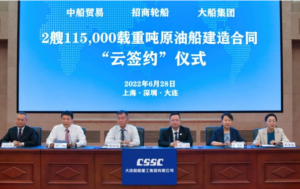 大船集团又签2艘11.5万吨原油船建造合... 2022/06/29 09:34:22 6月28日,中国船舶集团旗下中国重工子公司大船集团联合中船贸易与招商轮船在大连、上海、深圳三地以视频形式“云”签署2艘11.5万吨原油船建造合同