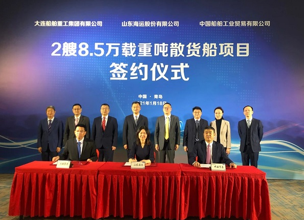 大船集团获2艘8.5万吨散货船订单 2021/01/19 10:39:00 1月18日,中国船舶旗下中船贸易与大船集团作为联合卖方与山东海运股份有限公司在青岛举行了2艘8.5万吨散货船建造合同的签约仪式。
