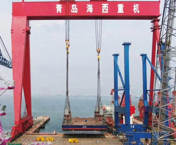 ????在该项目的前期建造策划阶段,海西重机没有采用常规船坞下水或滑移下水方式,而是大胆提出利用1600吨龙门吊整体吊装下水的设想。经过一系列重量预估及方案论证,最终核定吊装下水重量接近1440吨。