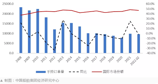 我国船舶行业手持订单持续优化 2022/02/09 02:11:43 我国船企手持订单量为9685万载重吨,全球占比为46.9%,继续保持全球第一