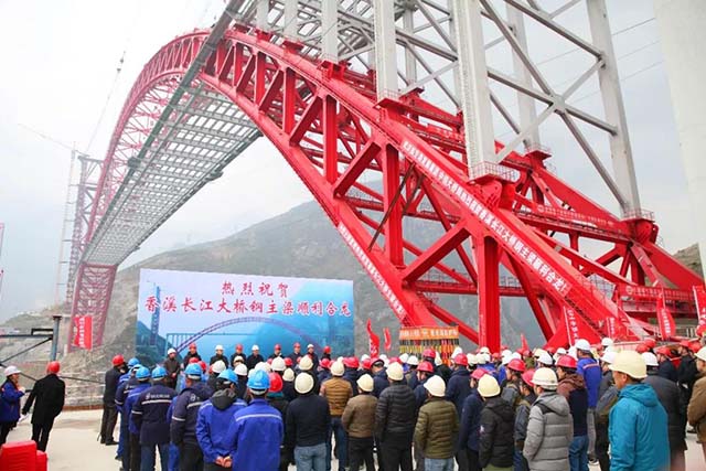 世界最大跨度钢箱桁架推力拱桥钢主梁合龙