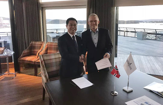 11月12日,青岛双瑞公司与挪威FRONTLINE公司在挪威奥斯陆签订营运船压载水改装合作协议,为FRONTLINE公司旗下的34条营运船进行压载水管理系统改装,船型涵盖VLCC、苏伊士油轮、好望角型散货船等大型船舶。青岛双瑞公司总经理付洪田、FRONTLINE技术总监Lars Pedersen作为双方代表出席签约仪式。