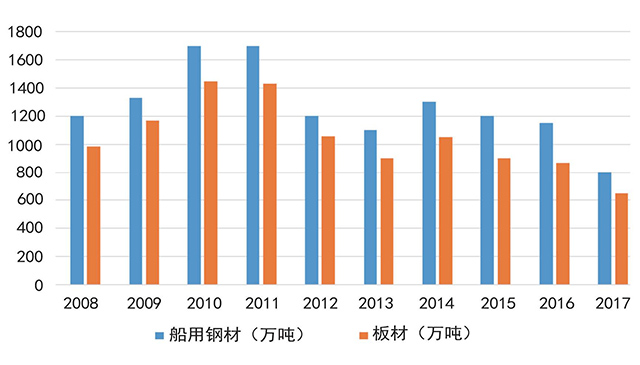 由图1可知,自2008年以来,我国船用钢材年消耗量最高时达1700万吨,2017年船用钢材消耗量将创下10年来的新低,钢材消耗量仅达800万吨,较2016年下降了30.43%。其中,板材耗用650吨,较2016年下降25.29%。