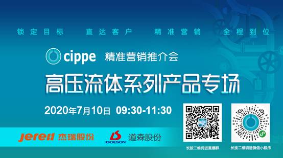 cippe精准营销推介会高压流体专场7月... 2020/07/10 12:00:00 7月10日上午09:30-11:30,由振威展览举办的cippe精准营销推介会?C高压流体系列产品专场将正式开播。此次活动cippe组委会在升级线上直播思路的基础上,加大了对专业观众的邀约力度...