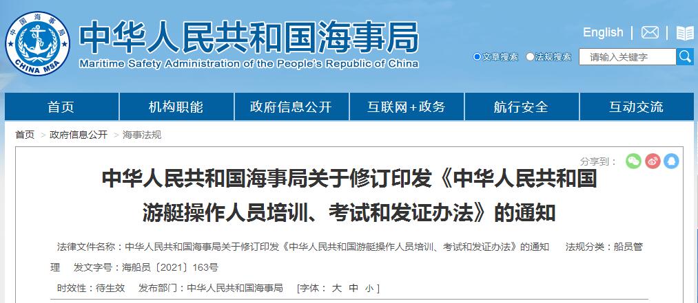 中华人民共和国海事局关于修订印发《中华人... 2021/09/03 02:30:00 《中华人民共和国游艇操作人员培训、考试和发证办法》业已修订,现予印发,请遵照执行。