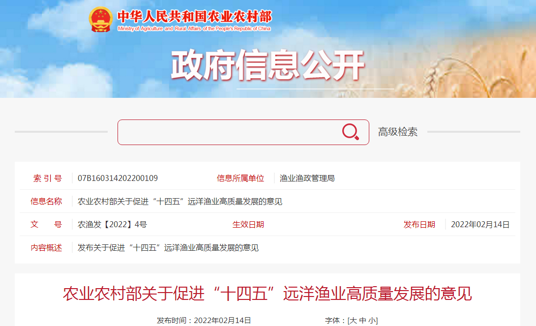 农业农村部关于促进“十四五”远洋渔业高质... 2022/02/17 09:00:23 近日,农业农村部发布《关于促进“十四五”远洋渔业高质量发展的意见》(以下简称《意见》)?!兑饧诽岢?,到2025年,远洋渔业总产量稳定在230万吨左右。