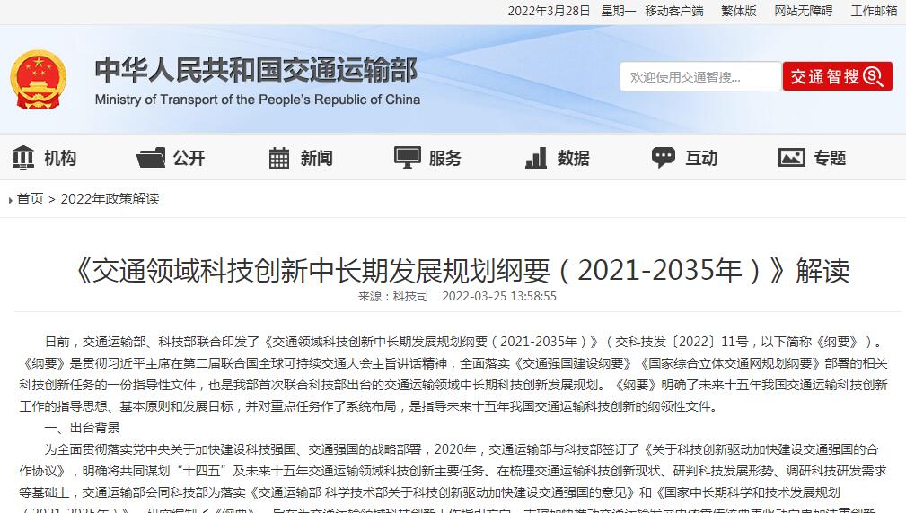 《交通领域科技创新中长期发展规划纲要》发... 2022/03/28 02:33:49 3月25日,交通运输部、科技部联合印发了《交通领域科技创新中长期发展规划纲要(2021-2035年)》(以下简称《纲要》)。《纲要》从交通基础设施、交通装备、运输服务三个要素维度和智慧、安全、绿色三个价值维度布局研发任务,其中多处涉及船舶行业。