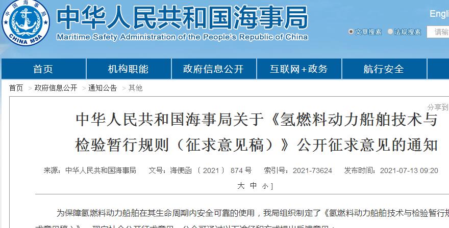 中华人民共和国海事局关于《氢燃料动力船舶... 2021/07/16 08:32:33 中华人民共和国海事局关于《氢燃料动力船舶技术与检验暂行规则(征求意见稿)》公开征求意见的通知