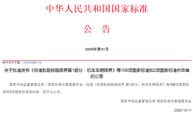 9项船舶工业国家标准获批发布 2020/10/10 07:55:00 2020年10月11日,国家市场监督管理总局(国家标准化管理委员会)发布2020年第21号公告,批准发布《标准轨距铁路限界 第1部分:机车车辆限界》等106项国家标准和2项国家标准修改单的公告,其中有9项船舶工业相关国家标准获批发布,全部为新制定标准,将于2021年5月1日起正式实施。