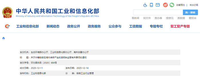 三部门关于外籍船舶在境内维修产生的废钢铁... 2020/12/15 01:52:08 外籍船舶在境内维修、改装产生的废钢铁,在符合国内固体废物管理相关法规标准条件下,准予在境内贮存、转移、利用和处置,不按照固体废物进口管理,无需办理固体废物进口许可证