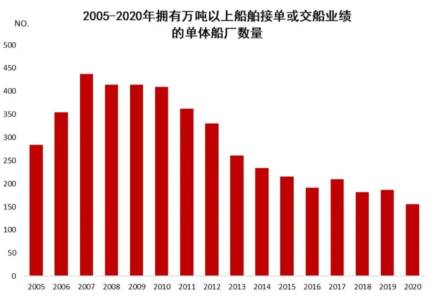 经过上述两轮产能调整,在市场的作用下,全球拥有万吨以上船舶接单或交船记录的活跃单体船厂,从440家减少至2016年的180家左右,并保持基本稳定;2020年受疫情及市场回调影响,接单或交船的船厂数量下滑至150家左右。近3年来,尽管造船企业经营依然艰难,但中日韩主要造船企业经济运行情况总体稳定,产能出清过程基本结束。
