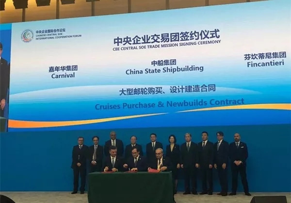 11月6日,中国船舶工业集团有限公司与美国嘉年华集团、意大利芬坎蒂尼集团在中国首届国际进口博览会上,正式签订了2+4艘大型邮轮建造合同,并举行了邮轮建造项目启动仪式。这标志着中国首艘具有世界先进水平的大型(豪华)邮轮正式启动。