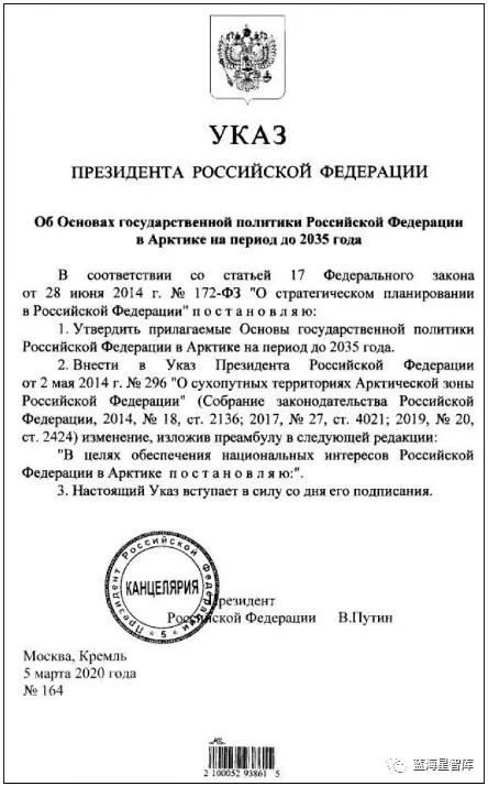2020年3月5日,俄罗斯总统批准《2035年前国家北极基本政策》。该政策明确了俄在北极地区的国家利益、面临的主要威胁和挑战,以及重点任务,是俄罗斯为保障国家安全和北极利益而制定的战略计划文件,主要内容如下。