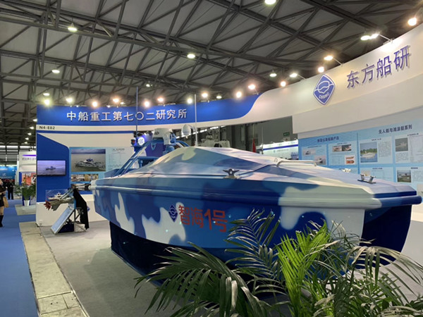 中船重工第七?二研究所是此次展会展出面积较大的展商之一,占据N4馆的主要位置,展台布局精美、展品多样。七?二所展出的“智海1号”无人艇气势磅礴,JARI-USV多用途无人作战艇、“广核1”海上风电运维船等数十个有代表性的船舶模型展列其中,引人注目,充分显示出了中船重工在船舶领域强大的科研实力和发展潜力。