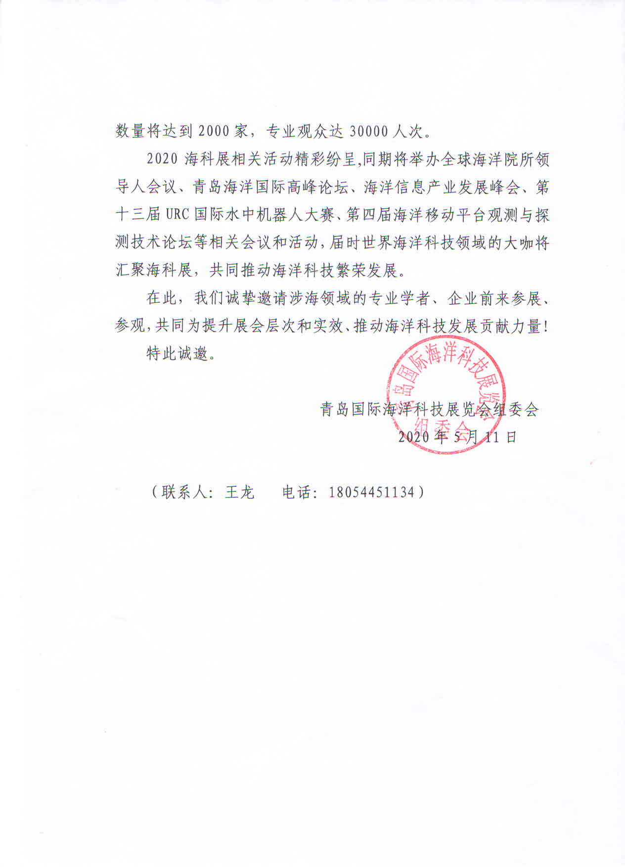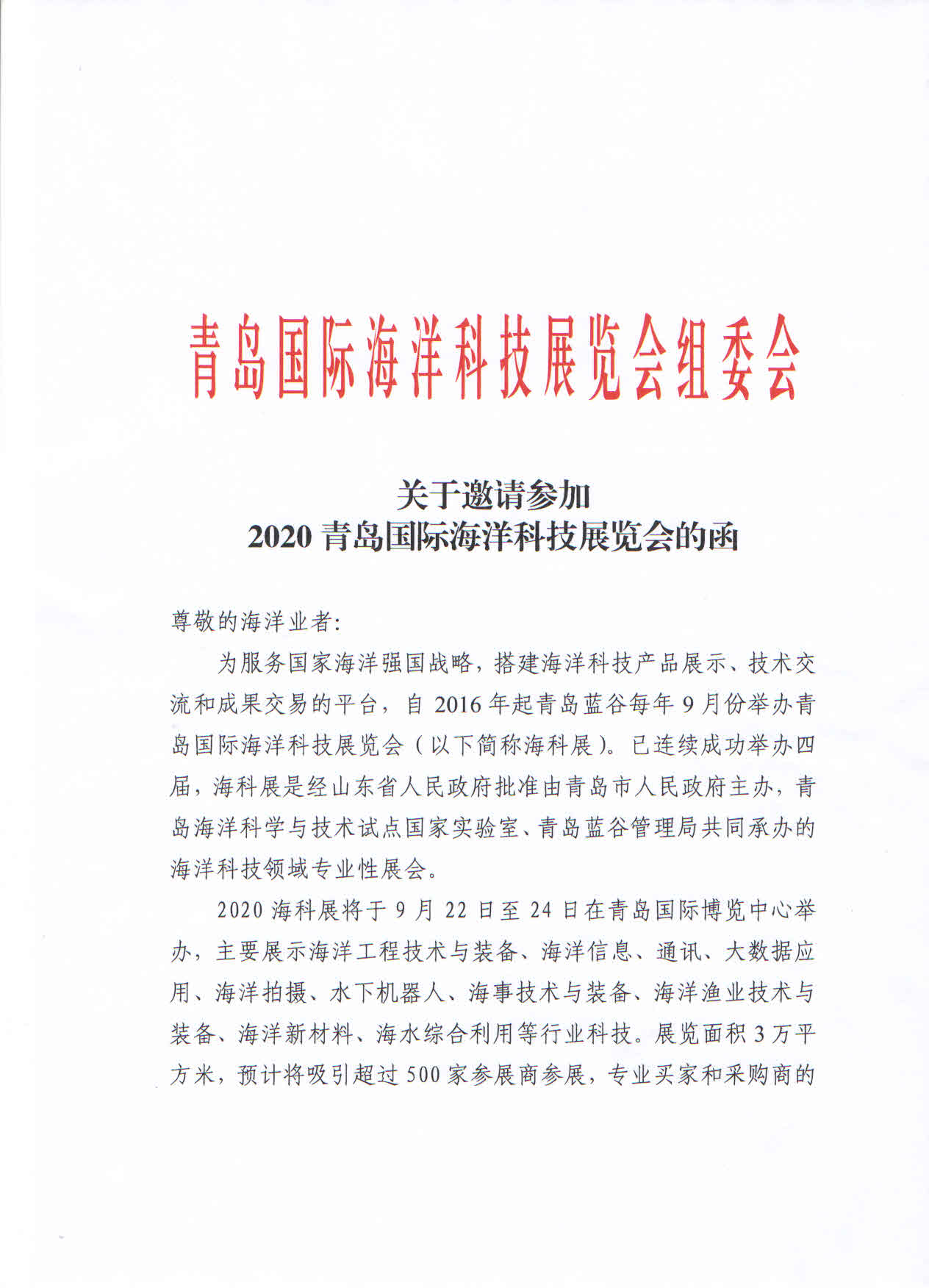 尊敬的海洋业者:青岛海洋科学与技术试点国家实验室与青岛蓝谷管理局共同邀请您参观2020(第五届)青岛国际海洋科技展览会(以下简称“展会”),展会信息如下: