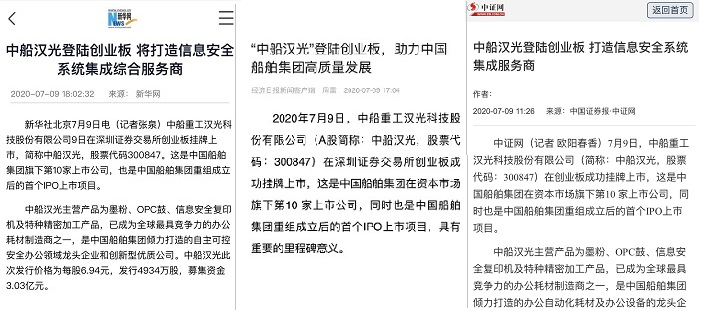 7月9日,中国船舶集团旗下 中船重工汉光科技股份有限公司 (A股简称:中船汉光,股票代码:300847)在深圳证券交易所创业板成功挂牌上市。这是中国船舶集团旗下第10家上市公司,同时也是中国船舶集团重组成立后的首个IPO上市项目。