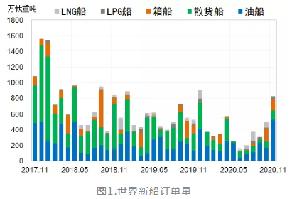 全球新造船市场出现回暖! 2020/12/17 01:51:01 11月份,批量订单集中释放,全球新造船市场出现一定起色,成交新船订单70艘、4312万载重吨,环比增加67%,同比增加55%。1-11月,全球累计成交新船订单679艘、4312万载重吨,同比减少32%。预计2020年全球造船市场新船成交量约4800万载重吨。
