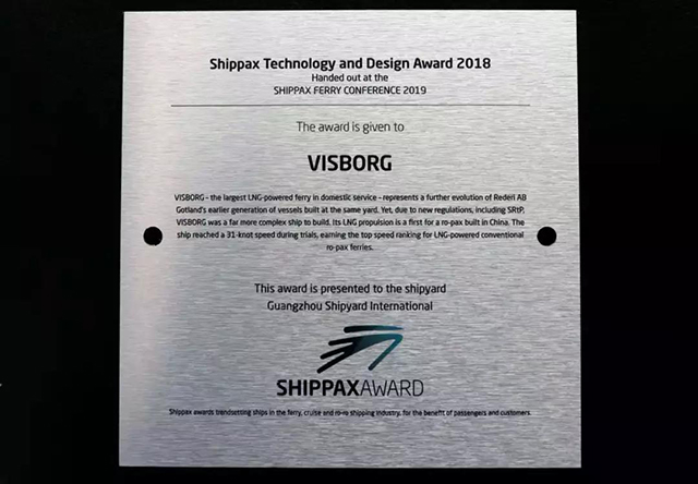 广船国际客滚船获造船界“奥斯卡” 奖 2019/03/21 12:00:00 由广船国际建造的客滚船“VISBORG(威斯堡)”号,获得了瑞典Shippax颁发的“2018年度最佳技术和设计大奖”。