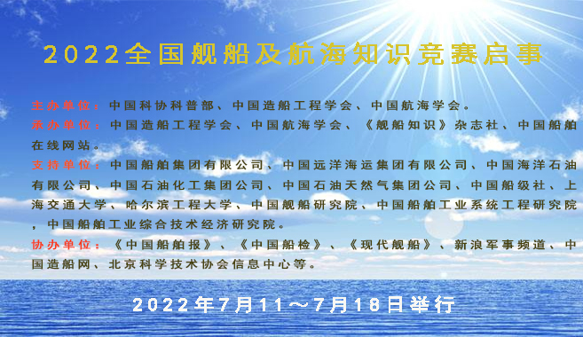 2022全国舰船及航海知识竞赛启事 2022/07/07 10:58:00 为全面落实国家《科学素质纲要》,庆?!爸泄胶H铡保嘌愦笄嗌倌耆劝婀?、热爱科学、热爱海洋、热爱舰船的情操,树立国防意识、海洋意识,普及舰船、航海和海洋等方面的知识,为相关行业培养人才
